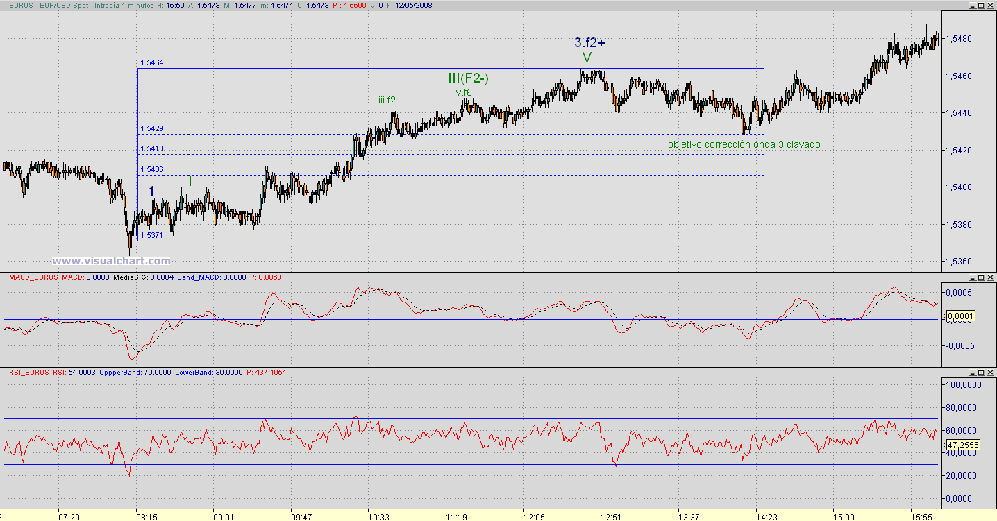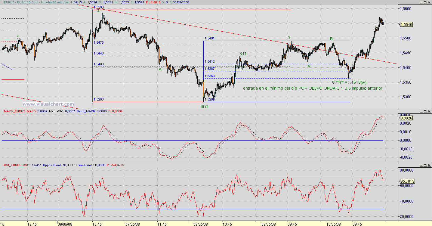 No lo veo para nada destructivo Mannanan, si a ti te funciona, me alegra que me lo comentes porque el Elliot las más de las veces me distrae de otros indicadores y hace que la pifie mucho. A veces me planteo el operar sin Elliot a ver como me va pero estoy tan habituado que no matrevo. De todas formas a pesar de todo quiero demostrarte que Elliot si que sirve para el intradía. Fíjate en los gráficos que te adjunto y mira como nos daba la entrada en el mínimo del día y después en la corrección de la onda 3 (si bien esta tenía sopertes tanto en 5 como en 15" y aquí si que sobraba Elliot (no obstante sirve de apoyo) porque lugo ha empezado la supuesta onda 5 que no ha parado ni pa cambiar pilas y la cuenta para esa Onda 5 no ha hecho más que liarme. El tema de ir a la contra sabiendo que la cosa pintaba bastos para los cortos si ha sido un error de cátedra, lo admito. No sé, tengo una especie de condicionamiento psicológico para el corto (por mi experiencia como operador siempre en mercados bajistas) que necesito combatir. En los mercados no se puede tener predilección por un sentido más que otro.
