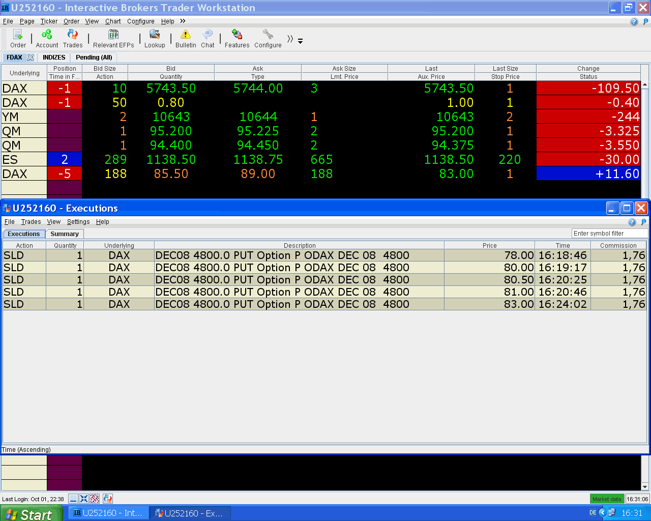 Otra venta de Opciones en el DAX, esta vez 5 Puts 4800 de Diciembre 2008 a 80,50 EUR (media), ingreso 2.000 EUR. A ver si así baja el DAX.