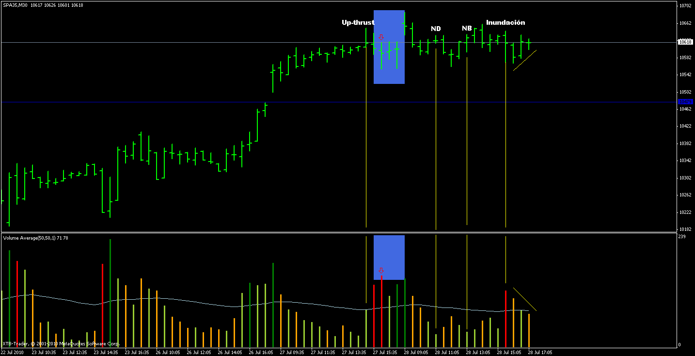 - Up_thrust clarísimo, sin mucho volumen eso sí, pero respondiendo bien la siguente barra bajista.