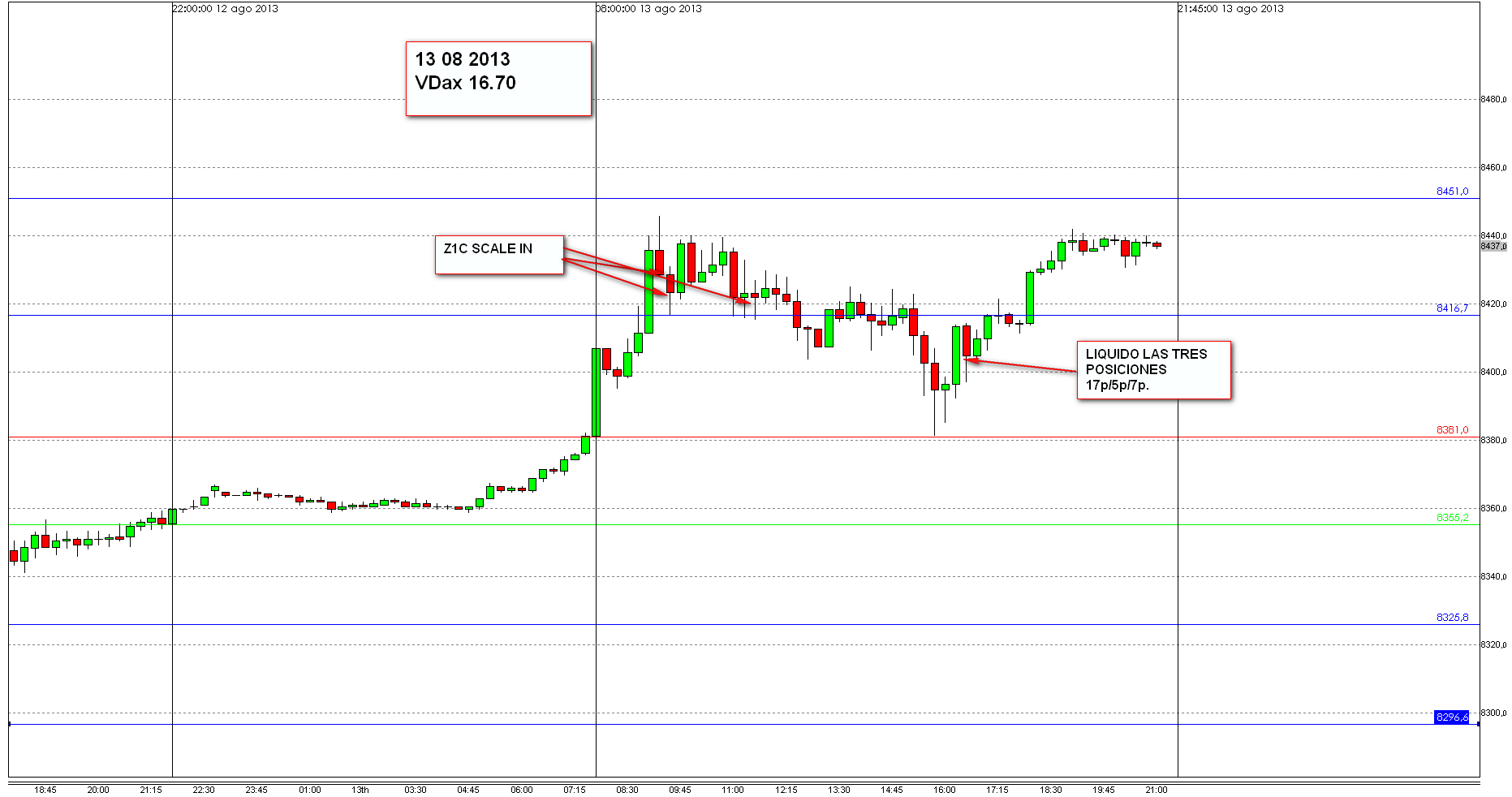 A las 9.30 ya habia tocado Z1C, con el Dow en el límite de zona +30 espero el reverse del Dax y entro con scale in a corto. Tengo un poco de incertidumbre antes de las 11h por la publicación del ZEW, aguanto las posiciones después de la publicación y el precio empieza a caer a mediodía.