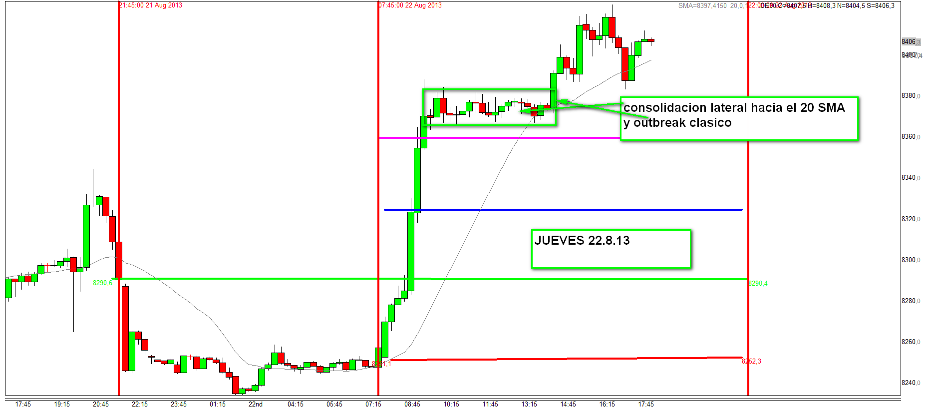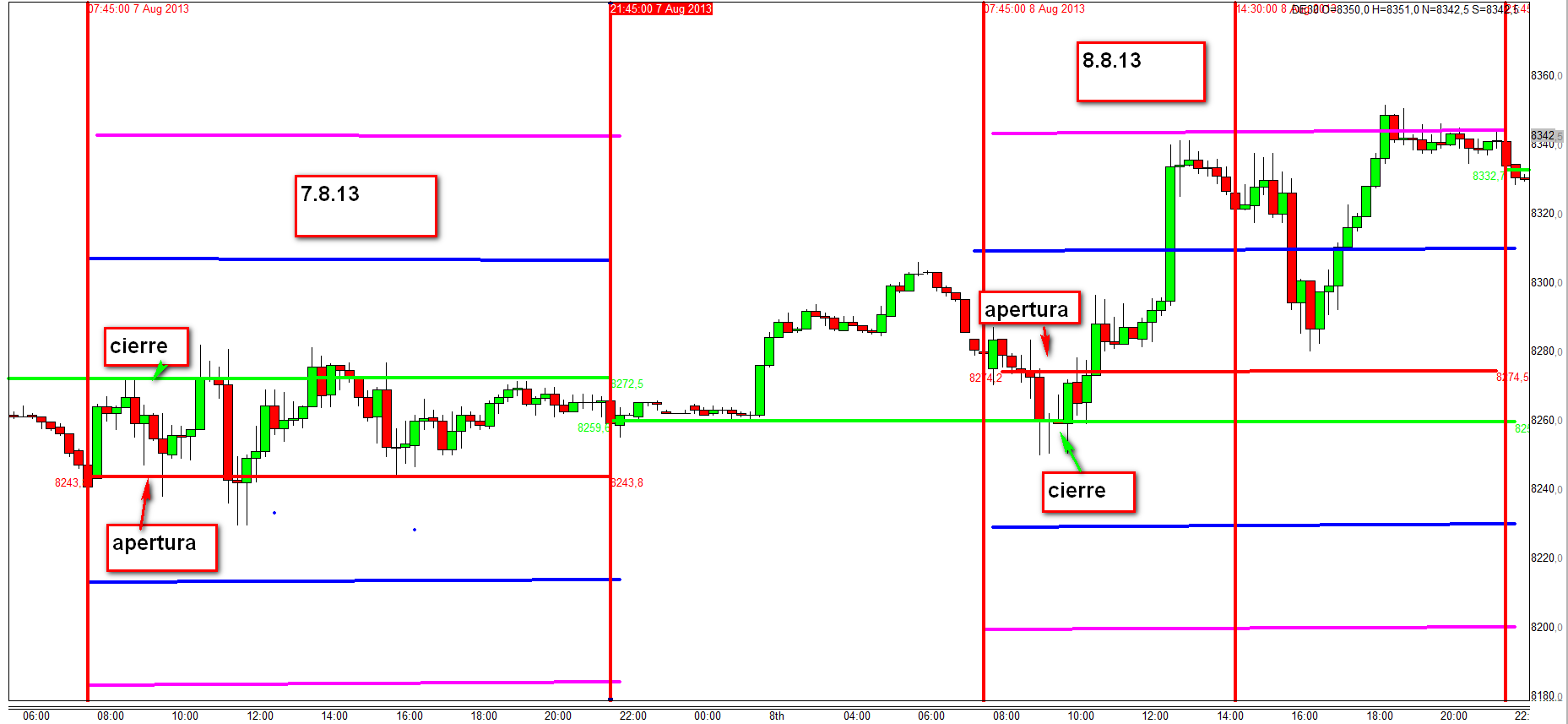 Adjunto grafico de los dias 7 y 8 de augusto. El 7 la apertura es debajo y el 8 la apertura encima del cierre. Los huecos 15+ puntos .