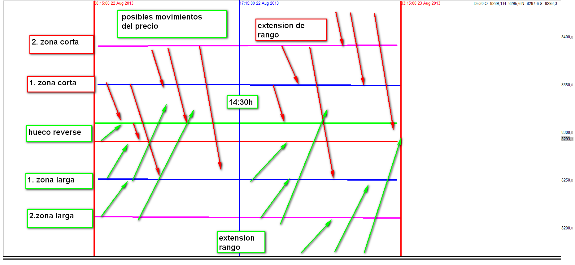 Las zonas de actuación serán calculadas en función de la volatilidad VDAX-NEW. Para realizar dichas zonas, se debe tener en cuenta el precio de cierre del dia anterior a las 22.00h y el precio de apertura del mismo dia de operativa a las 08.00h.