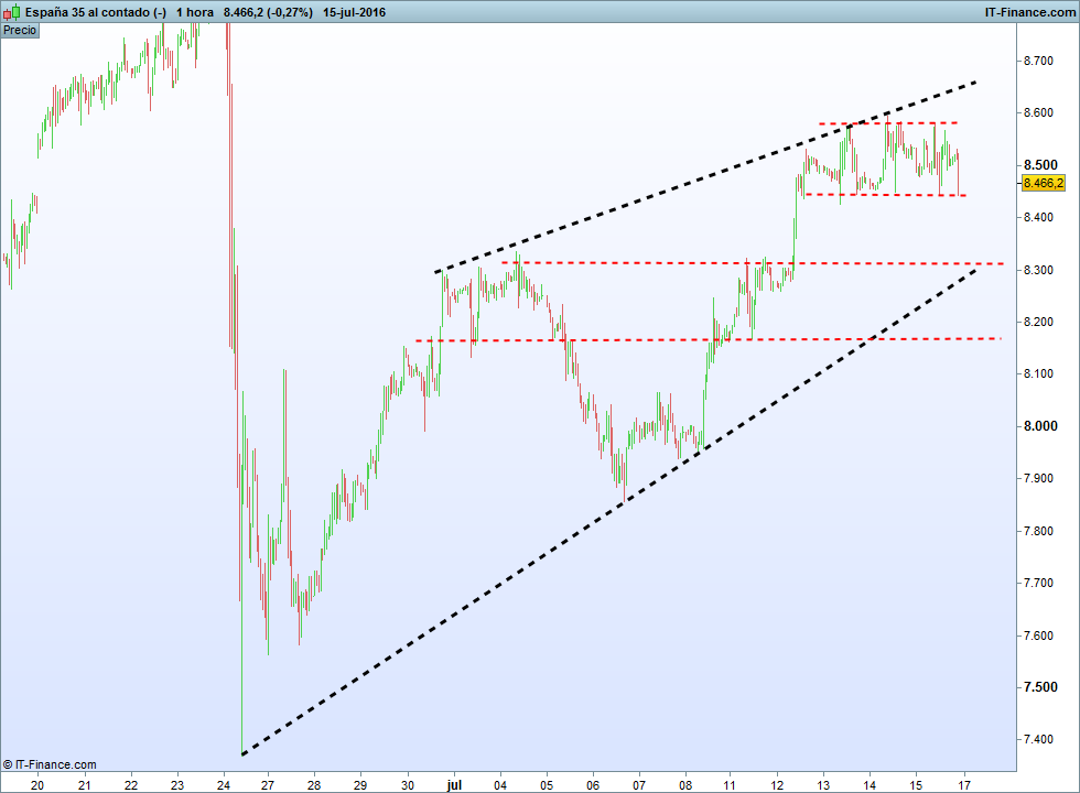 El análisis de estructuras es de vital importancia al operar tendencias, ahora mismo el Ibex esta largo en una hora con un rectángulo en techo con tres días de formación, la rotura de esa figura por abajo deja vía libre hasta el 8300 y todavía seguirá estando largo en ese timeframe, la perdida de ese nivel seria entrar en tendencia corta a favor de tendencia diaria. Si yo estuviera largo en ganancias ya habría cubierto en el techo del rectángulo y la cerraría si supera ese nivel con stop muy ajustado