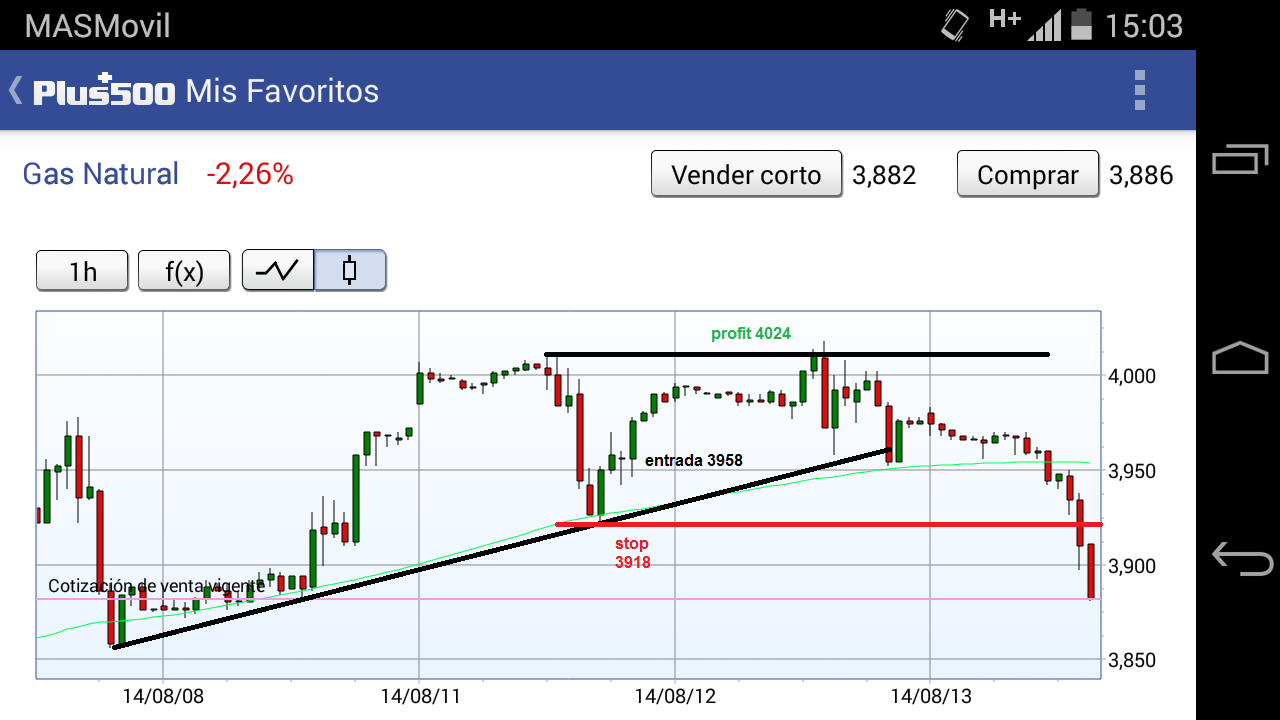 Se entiende todo de maravilla, uso graficos de 1 hora para operar, aunque tambien miro en el diario para tendencia, soportes y resistencias que no se ven en el grafico de 1 hora, las operaciones a veces me duran 1 hora y aveces dias y pocas alguna semana.