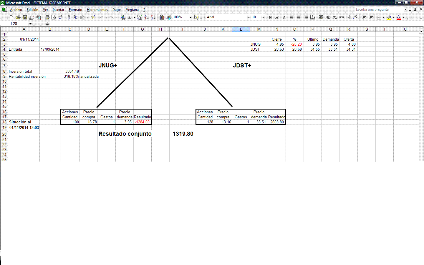 Mi criterio de que en caso de subidas, UVXY se revalorizará más que VXX se basa en la simple aplicación del interés compuesto, si evolucionan subiendo UVXY el doble que VXX, tendría que funcionar, de todas formas, he colocado un indicador en el excel que me va a ir señalando si esto se esta cumpliendo.