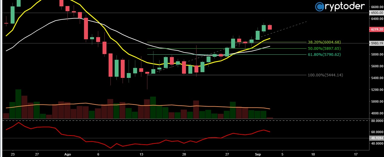 Dibujando un Fibonacci dese el último punto más bajo, podemos observar como el precio se mueve por encima del nivel de retroceso del 38.20% permitiendo que el sentimiento de mercado sea alcista entre los inversionistas. Actualmente un soporte importante se marca en los €5980 es decir justo en el 38.20% de Fibonacci.