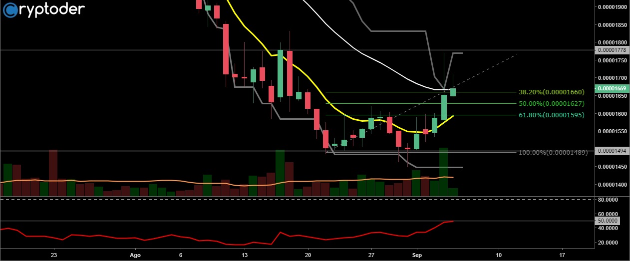 El precio logró romper el canal bajista en el que se había estancado por semanas, ahora lo más importante es que el precio logre romper la resistencia en los 0.000764 BTC (‎€4,56) para ver una recuperación real.