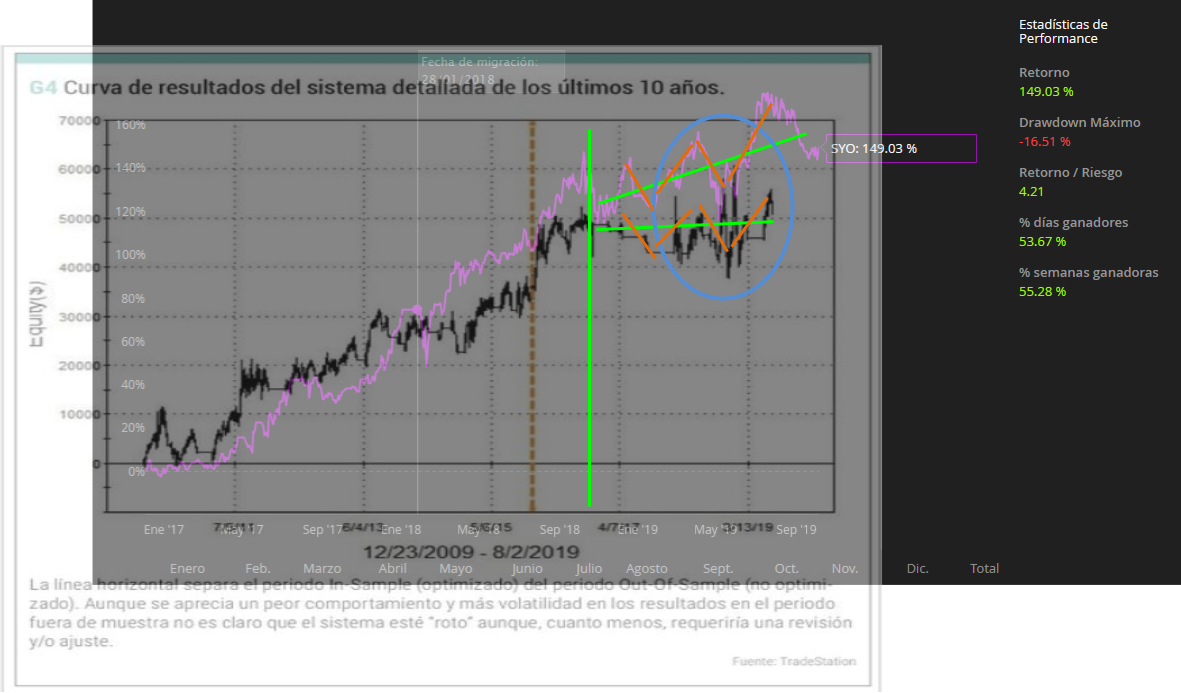 Surgiría aquí un ejercicio interesante, quizá sería tema para los que escriben artículos: supongamos uno o varios activos que tienen una tendencia prolongada (como les viene ocurriendo a Nasdaq y S&P500 desde hace bastantes años), supongamos que se aplica un mismo sistema a uno de ellos o a los dos, en diferentes tramos de la tendencia, con estudio dentro y fuera de muestra. ¿Saldrían curvas de balance similares aunque desplazadas en el tiempo?.