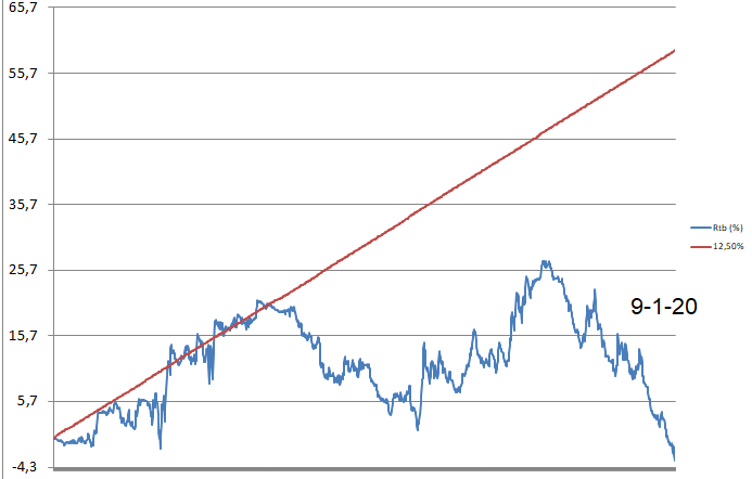 Comparación de los resultados objetivo (proyectados), frente a los conseguidos desde inicio de la SICAV (línea roja: objetivo, línea azul: conseguido):