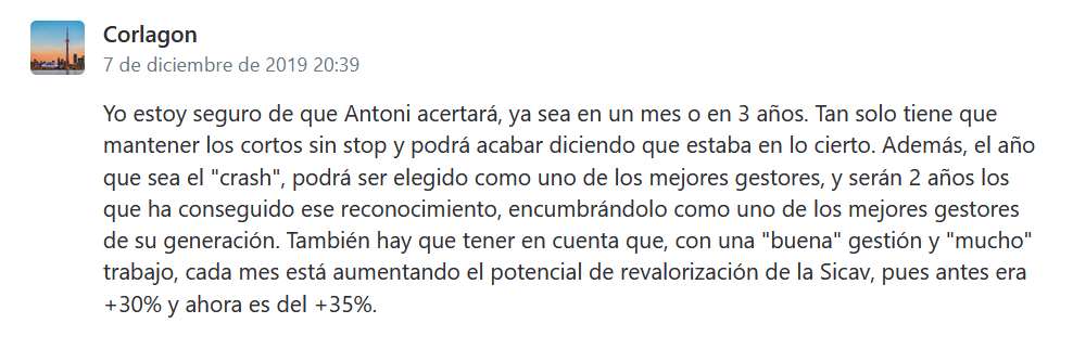Leo todos los informes mensuales de la SICAV y sigo su foro. De momento se puede decir que la sigo muy de cerca, porque hasta ahora me sigue interesando por varios aspectos. Uno de ellos es la perspectiva, el por qué, presidente y gestor mantiene, cada uno en su parcela, toda esa posición, tanto ante los Mercados, como ante la masa social, público en general, etc. Cuáles son las motivaciones, las causas.