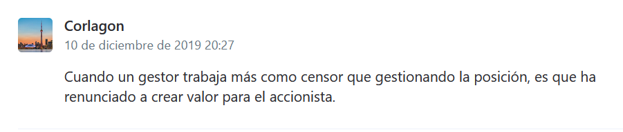 Wikmar escribió: 14 Ene 2020 06:50 Uno de ellos es la perspectiva, el por qué, presidente y gestor mantiene, cada uno en su parcela, toda esa posición, tanto ante los Mercados, como ante la masa social, público en general, etc. Cuáles son las motivaciones, las causas.