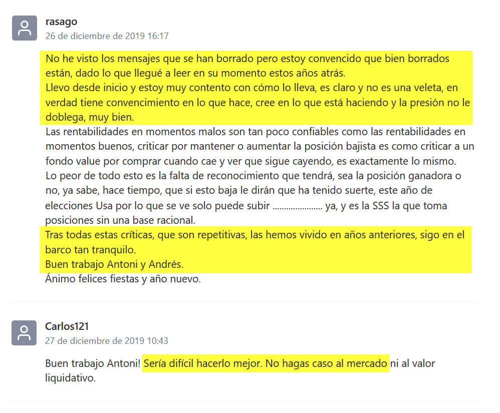 En lo social: decenas de mensajes eliminados del foro de la SICAV, se supone que por parte del presidente. En mi opinión, mensajes completamente dentro de la libertad de expresión, dentro del respeto personal e institucional, y si me apuran; suaves. Dos ejemplos de los eliminados: