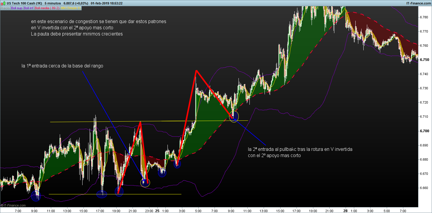En pautas de congestión entra en el techo y en la base del rango con patrón de V o V invertida con el ultimo segmento mas corto y entra al pullbakc tras la rotura