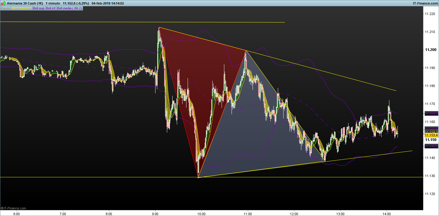 Si llevas puestos en la grafica de 1 hora todos los S/R que marque y los prolongaste a la derecha, abajo te toco soporte en 11130, toca y rebota 70puntos apx, si esa no la pillaste a largos y esta mañana no pillaste el corto a las 9 en el techo del rango ya no hubo mas oportunidades hasta las11 con patrón en V a cortos y abajo a las 12,40 gira a largos y marca un triangulo dentro del rango