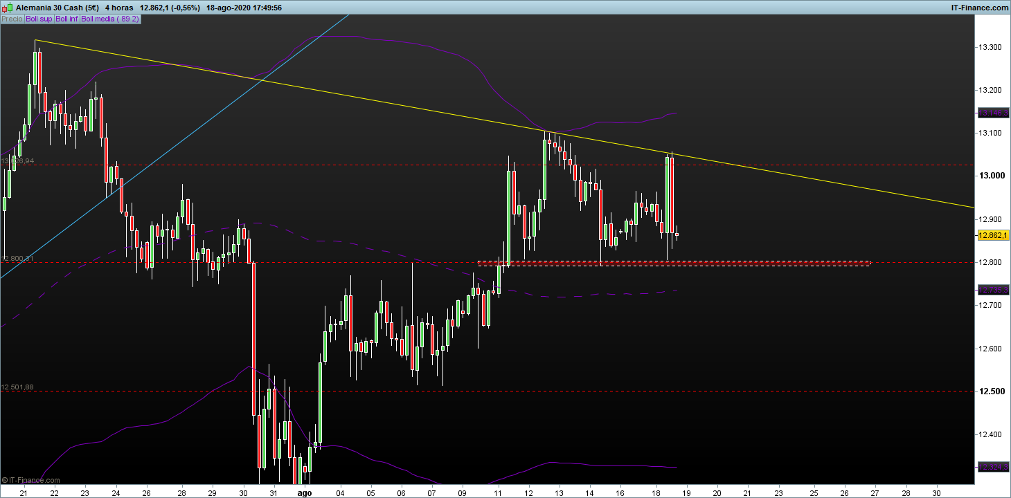 Hoy no hay configuracion de rango y el soporte ya es historia, esta muy lejos, la pauta de hoy es tendencia en 30m y en la base del canal de 30m dio una entrada en 12863 apx,practicamente en zona de minimos de lo que lleva de sesion pero hay que tener en cuenta la bajista que arranca desde el jueves que ya la testeo hoy en la apertura de 9 a 9,30, mas tarde 2 testeos mas , ahora mismo el ultimo