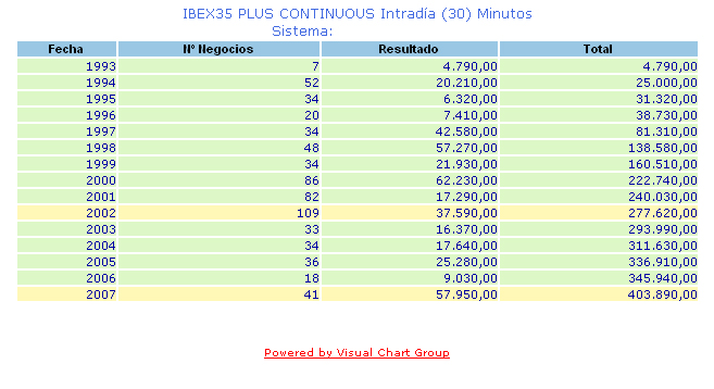 Puede ser que haya sistemas mejores y en adelante se consigan con mejores resultados, lo digo porque he diseñado otro que es una modificación de éste y las mejoras potencian los resultados incluso poniendo 6 puntos de gastos que es el doble, de momento me lo guardo y no pondré los resultados hasta que lo vea conveniente.