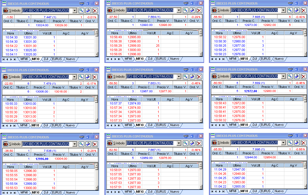 Siguiendo con el tema de los Slippages y del aumento que ha ido experimentando el FIbex en la horquilla de precios he tomado varias imágenes del cuadro de posiciones, como se puede ver esto es lo normal que viene sucediendo en estos meses, hoy que no hay mucha volatilidad el promedio de las muestras está en 8 puntos de diferencia entre compra y venta. Esta es una de las principales causas de tener las probabilidades en contra cuando se hacen muchas operaciones en el día o en intervalos cortos de tiempo...