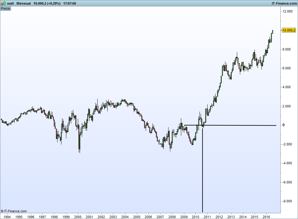Ese mes de agosto de 2010 el diferencial entre el Dow y el Ibex estaba a cero, tenían el mismo valor en puntos.