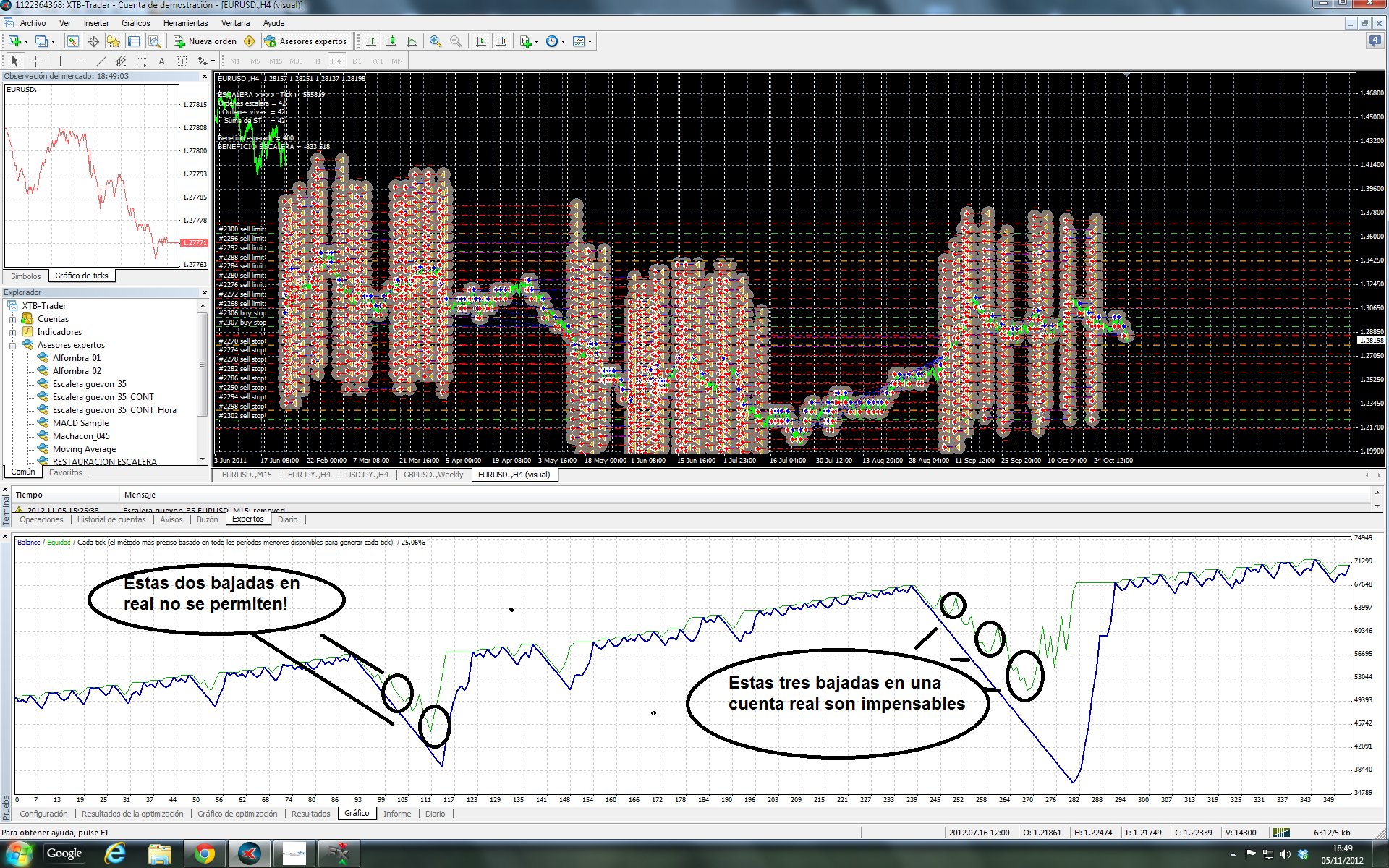 A ver, díme en qué dia y hora has lanzado una de las escaleras. Yo te pongo un gráfico y salimos de dudas. Por mucho mercado lateral que hayas encontrado estamos hablando de ¿cuantos dias?. Si para algo sirve un test es precisamente para ver la evolución en distintas fases de mercado. Y, digo yo, que en casi tres años habrá habido MAS lateralidad que en tus pocos dias, que, para más inri, están incluidos en en el test.