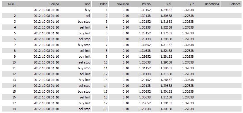 Una buy y una sell en el centro (1.30160) y cinco más por arriba y cinco más por abajo