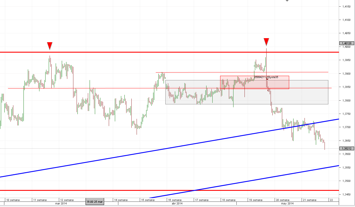 Una vez confirmada la ruptura del 1.364, según mis fivos le veo un objetivo de caida mínimo hasta el 1.3502 pero el 1.338 ni tan mal oiga. Si hay corrección alcista pero sin señal clara de giro serio a alcista tal vez podríamos entrar cortos con esos objetivos. En fin habrá que tratar de afinar y no arriesgar mucho que si es que abro un corto según lo veo yo es a contratendencia.