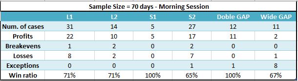 Hasta el momento las mejores zonas para operar en la mañana han sido el doble GAP y la primera zona de cortos (S1), con un 100% de efectividad, aunque se han dado muy pocos casos 5 y 12 sobre 70 días respectivamente.