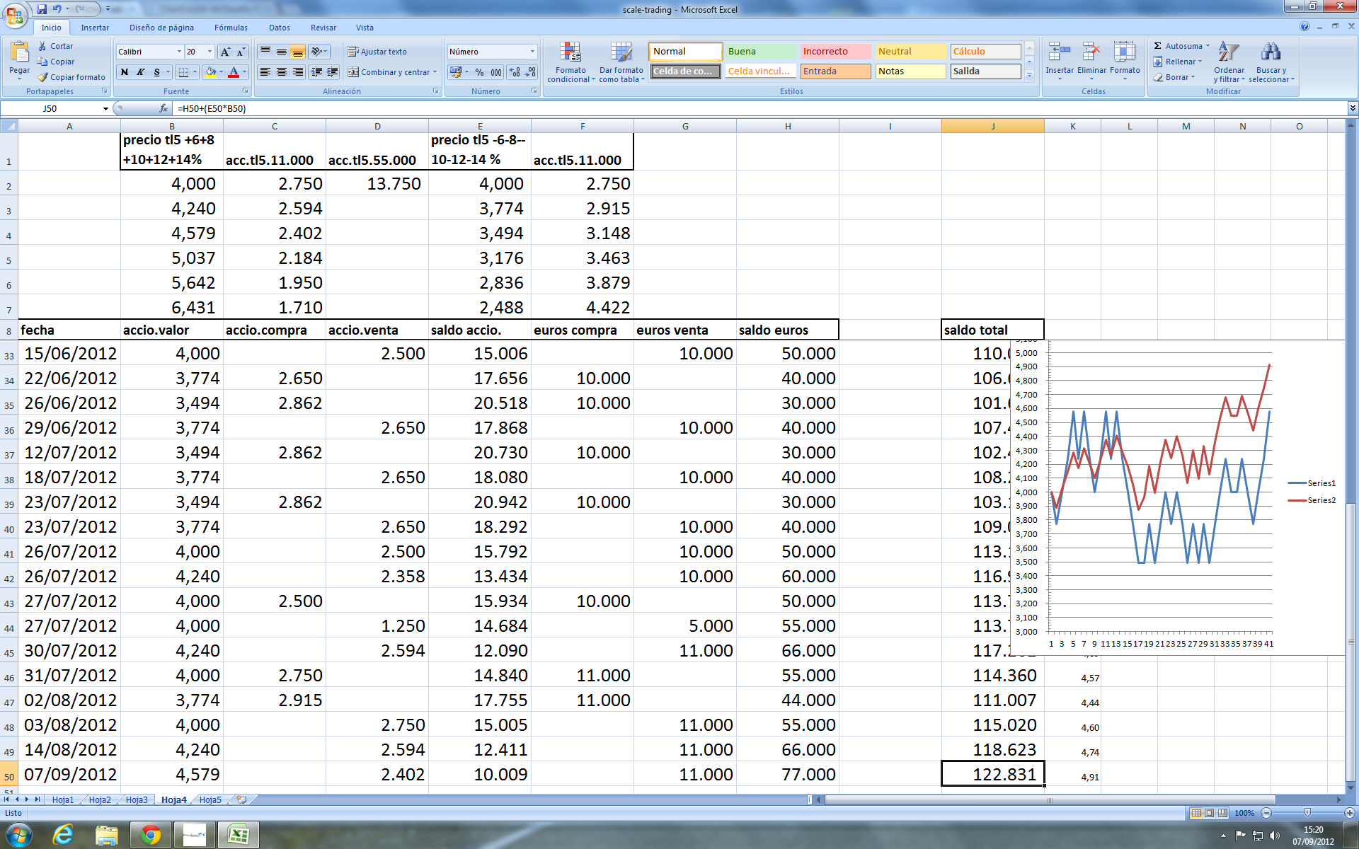 Si lo hubieramos comenzado con un reparto 30/70 en estos momentos nuestra ganancia en porcentaje seria de mas de un 22% y tendriamos casi los mismos escalones por arriba como por abajo, e incluso los riesgos corridos hubieran sido menores... (esto ultimo es discutible)... pero eso si, hubiera sido igual de sencillo que como lo hemos ido haciendo, e hubieramos sacado un 6% mas de ganancia...