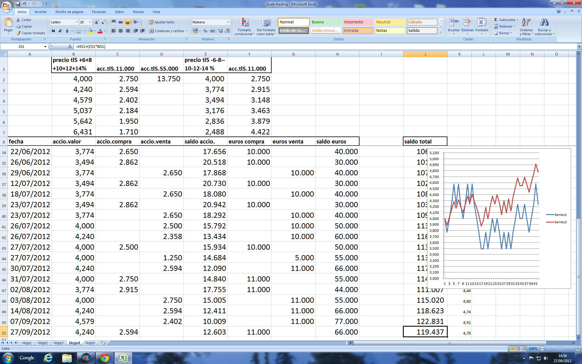 No vale Luis, este hilo no habla de tradear, habla de medio-invertir, habla de medio-conservar, no se, pero esto no es tradear, no vale hacer simulaciones anteriores, para mi esto seria el plan ideal para el que quisiera hacerse un plan de jubilacion a 20 años... 40 operaciones anuales..., sin problemas de pensar... a los tres años... uno piensa en hacer gestion de capital??? puede hacerla tranquilamente... piensa en hacer diversificacion con los beneficios??? puede hacerlo tranquilamente... en 20 añosss ... solo hace falta imaginarse cuanto tendriamos ahora haciendo lo que estoy haciendo con el santander si hubieramos empezado hace 20 años con un capital similar a los 100.000 euros que comence yo...Spirit escribió:Este hilo te lo he respetado al máximo Guevon porque lo has planteado como una prueba-estudio y como tal, lo interesante es ver como evoluciona y a que conclusiones llegas.