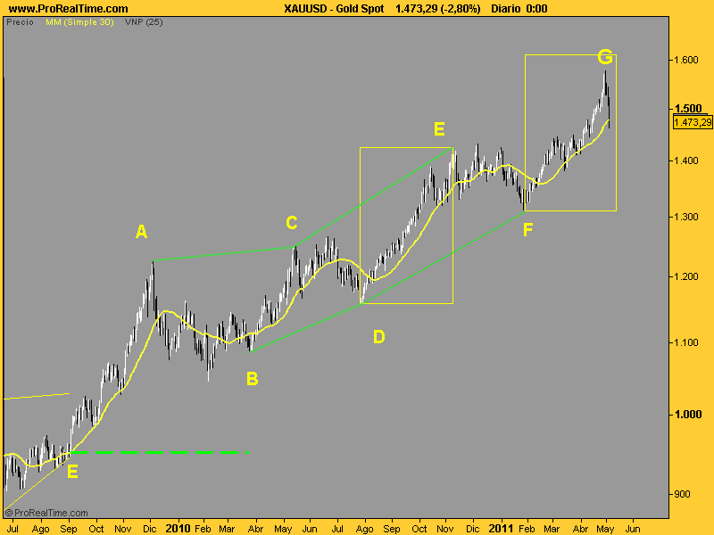 Con el euro no me aclaro demasiao...pero el oro me da un techo bastante evidente que esperaba: el último arreó era una diamétrica que tenía que acabar teóricamente antes de salir del rectángulo ese que pongo. Visto lo visto, si el oro ha techao, eso significa que probablemente el dólar se revalorice.