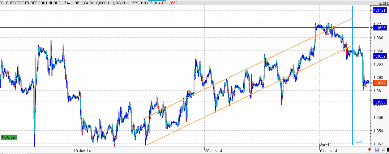 Esta tarde, cuando comentábamos (y desparramábamos), no había oído las declaraciones del sumo sacerdote. Una vez oídas, me han perecido tirando a "light"; nada nuevo, y sin mayores advertencias de matón. Que haya tenido y siga teniendo dadas instrucciones de sacar el bate de vez en cuando, no me extrañaría, pero el bicho (el €/$), me da que con la reacción que se ha aguantado hacia el 1,3610, de momento hace suelo y remontará (salvo bate baseball), no como nueva tendencia, pero me refiero a un movimiento hacia el canal ascendente que venía haciendo.