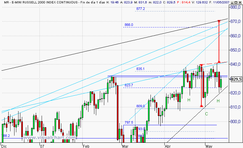 Hoy no he hecho ninguna operacion , ya que tenia cosas mas importantes que hacer, pero os pongo un gráfico de como he visto el mercado del mini-RUSELL y la bonita figura 2HOMBROS-cabeza-HOMBROS2 que está desarrollando entre ayer y hoy.