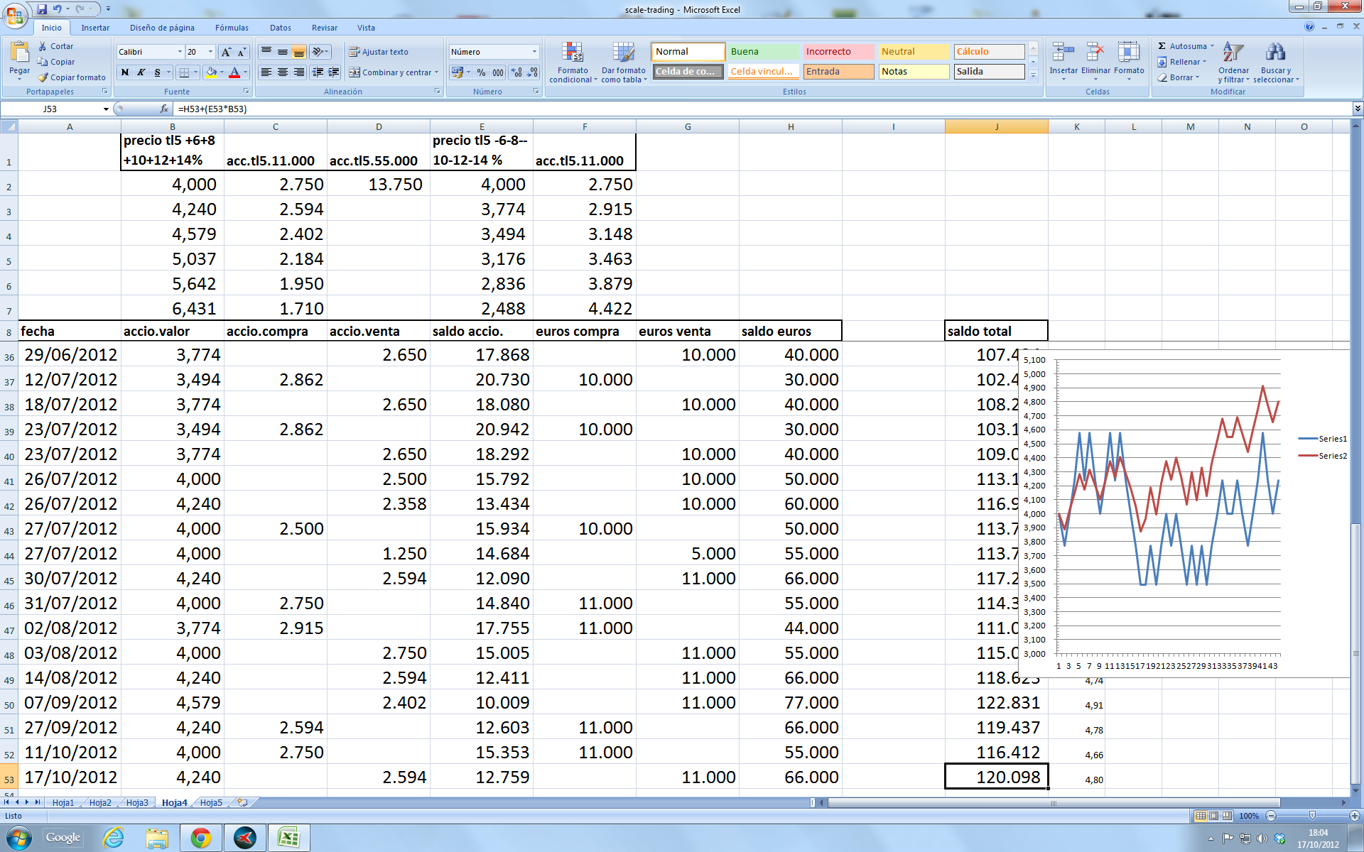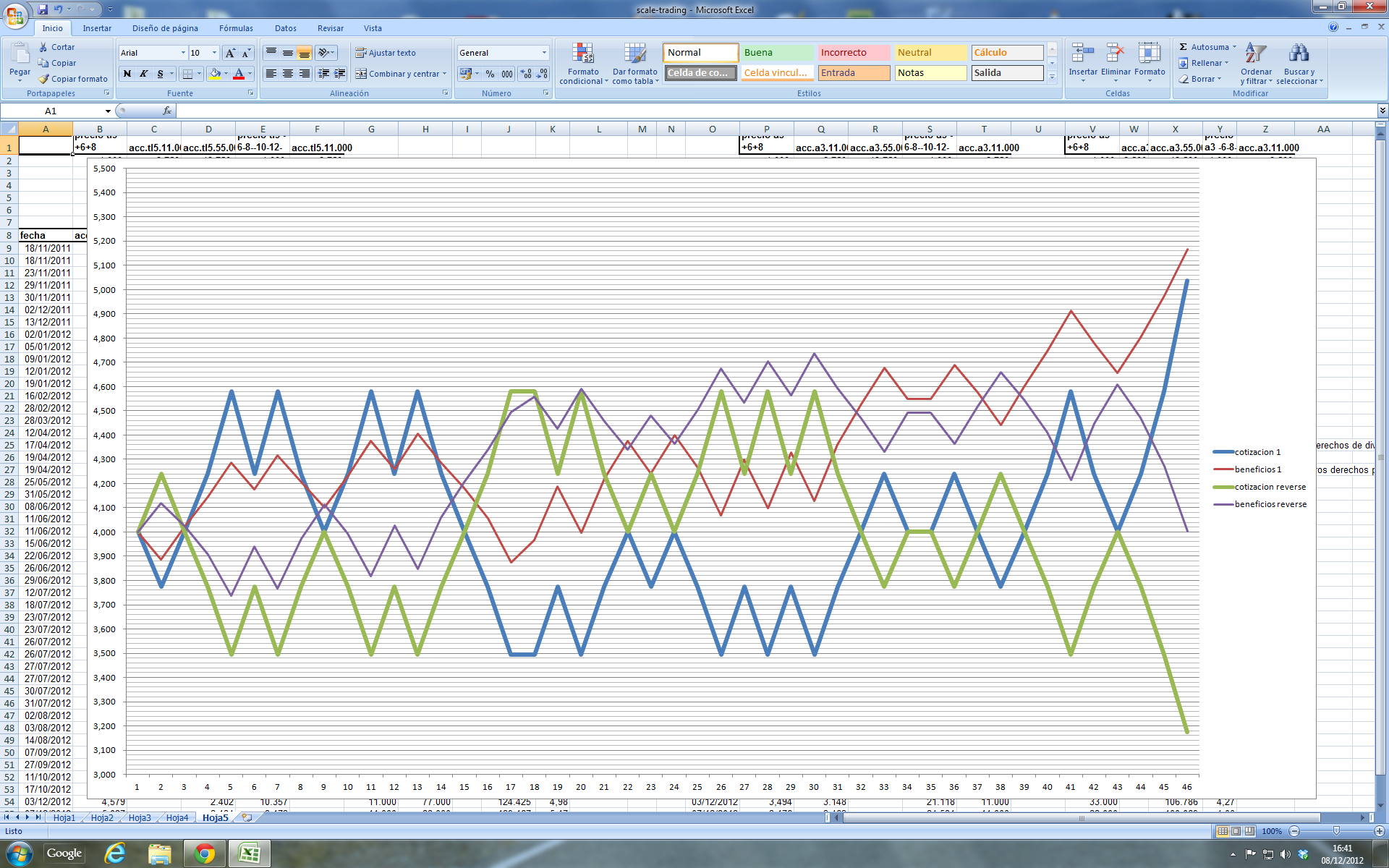 Bien, con tl5 yo he hecho como si tuviera un contrario correlacionado perfectamente negativo y he hecho un grafico... aparecen las dos cotizaciones, la de tl5 y la de su contrario, y sobretodo aparecen los resultados de la estrategia aplicados a las dos cotizaciones...