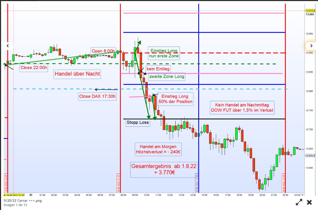 La primera zona de cortos, línea azul superior (en adelante S1) se alcanzó en la vela de 15m a las 9:30, pero tal y como se observó, no hubo reversión y por tanto esperamos y no entramos, fue en la vela de las 10:15 donde se produjo la reversión y por tanto ese punto se convierte en la primera zona, a partir de esta entrada se modifica el marco operacional situando la segunda zona de cortos (S2) 50 puntos por encima de la entrada y el STOP de pérdidas a 85 puntos de la entrada. La experiencia y audacia de cada uno entra en juego, en mi caso salí con breakeven, pero los más expertos hubieran obtenido el 100% del trade tal y como refleja Georg en su gráfica.