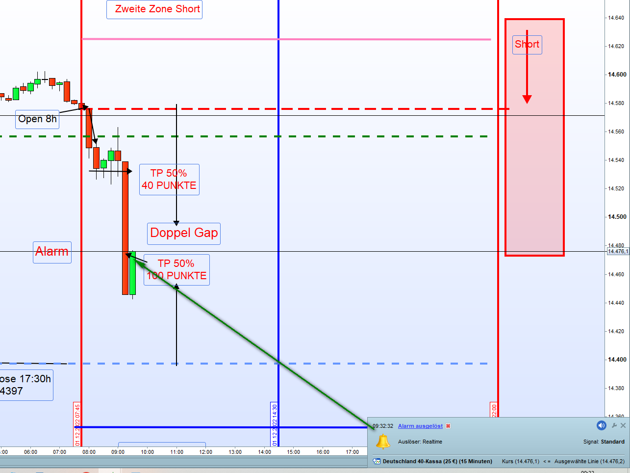 Setup 4 por la tarde con éxito. Luego no se abrió ninguna posición, ya que el DOW bajó un 1,35%. Véase el texto de la estrategia.