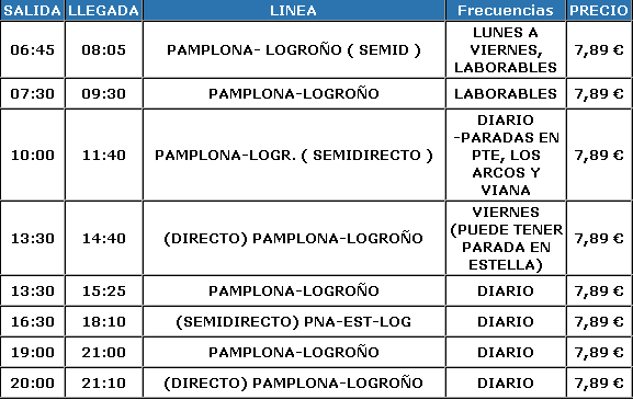 Pongo los horarios de Viernes (Pamplona-Logroño) y de Domingo (Logroño-Pamplona). Estos horarios son los de ahora, de aquí a Octubre pueden cambiar, así que recordar revisarlos.