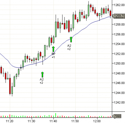 Una de las razones por las que las A2 son mi entrada favorita es que si puedes tomar una relativamente temprano en un día de tendencia, puedes cabalgarla hasta que te saque el stop al rebasar un giro bajo anterior. Por ejemplo, si entraste encima de la vela 34 en este día, podías mover tu stop debajo de cada giro bajo y finalmente te sacaría en la vela 78. En días con A2 que no se convierten en día de tendencia, puede representar una pérdida de 1 o 2 puntos, pero en días de tendencia puedes tomar 8 o más puntos.