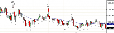 Una operación de DP (retracción de doble fondo o doble tope), que es por naturaleza una operación de alta probabilidad se desarrolló en la vela 63 seguida de una A2 en las velas 72 y 73. Observa que cada señal de corto decente desde la vela 16 tuvo éxito, por lo que la A2 era ciertamente candidata a una operación de swing.