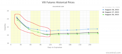 Personalmente no entraría en una posición vendedora neta de opciones con una curva de futuros del Vix como ésta, en pleno backwardation, que el último día además no se relajó un ápice:
