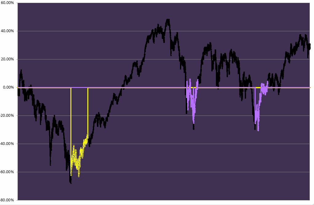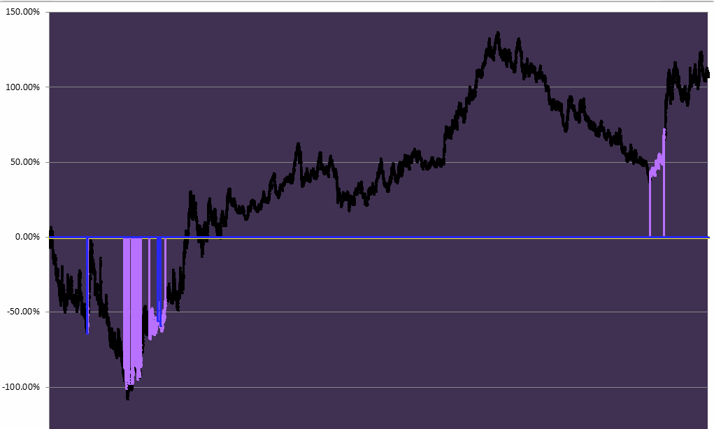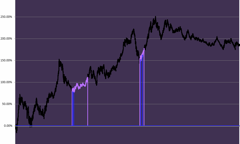 La metodología es la siguiente, las franjas en lila quiere decir zona de timing con objetivo mínimo de recompensa del 40%. Una vez finalizada la zona de timing entrarían otros conceptos, pero el estudio lo que trata de establecer es en que probabilidad con un multi universo podemos establecer un criterio objetivo de timing.
