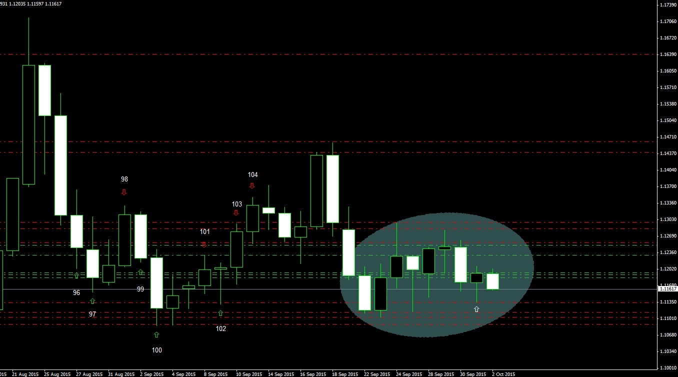 Estrictamente hablando, la vela es claramente alcista y mi obligación era o bien no poner ninguna orden o comprar. Ante la extensión del Stop, no he puesto nada hasta ver si había retroceso. La posible pérdida total es la misma (-4%), pero son bastantes menos pips, lo cual aumenta el ratio risk/reward. Creo que esto es la discrecionalidad bien entendida. Mismo riesgo de pérdida, mayores ganancias posibles: win-win.