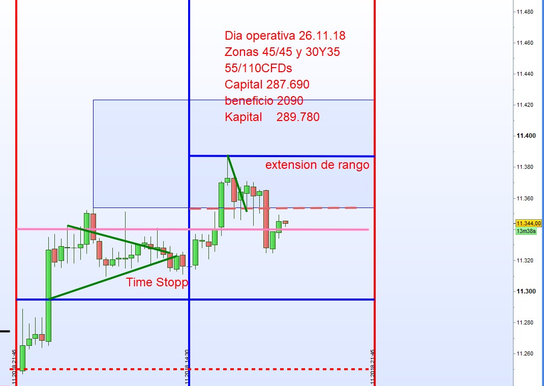 Asi pues para hoy habia dos posiciones abiertas, en la primera y segunda zona, y ambos han sido cerrados a las 14:15h con un beneficio de 440€. Luego hubo una entrada corta en la extension de rango que ha anadido 1650€ =