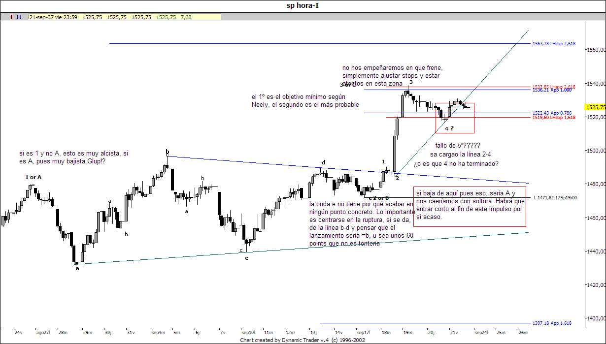 Creo que estamos en una onda 4, no un descenso significativo, y es posible que se haya acabado hoy en el SP, pero como me ha mareao un webo me he fijado en otra cosilla que ahora mismo parece interesante:el euro ha hecho hoy una figura de vuelta: un nuevo máximo y un cierre en la parte baja. Creo que va subiendo con treses y no me voy a explayar en el asunto. Lo prudente sería meterse al perder el mínimo de hoy con stop en el máximo, pero bueno...