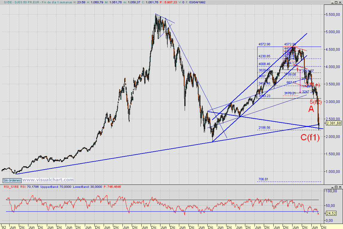 . U sea un 90% de pérdida desde máximos, igualito que en el crack del 29. Claro que, si tenemos en cuenta que en ese año 29 (el primer año de caida) cayo un 49% y luego recuperó el 52% antes de seguir cayendo pues a lo mejor ahora que ha perdido el 44% rebota fuerte, o a lo mejor rebota un poco más tarde, o incluso no hay tal gran rebote y sigue cayendo y cayendo... Si decides jugártela y aguantar ese largo que parece que has enganchao por si esto es un rebote gorrrdo me centraría en el fivo del 0,382 (10.300), la onda A ha traspasado el primer fivo en 9418 por lo que es de esperar que C llegue al siguiente al menos, aunque el nivel 10030 tb es importante por C=A a ver qué hace por ahí. En cualquier caso nunca mantendría por encima del 10.930-11030 porque es nivel de Di Napoli, ahí coinciden el citado 50% de recuperación y el 1,618 para la onda C correctiva que parece que se está formando.