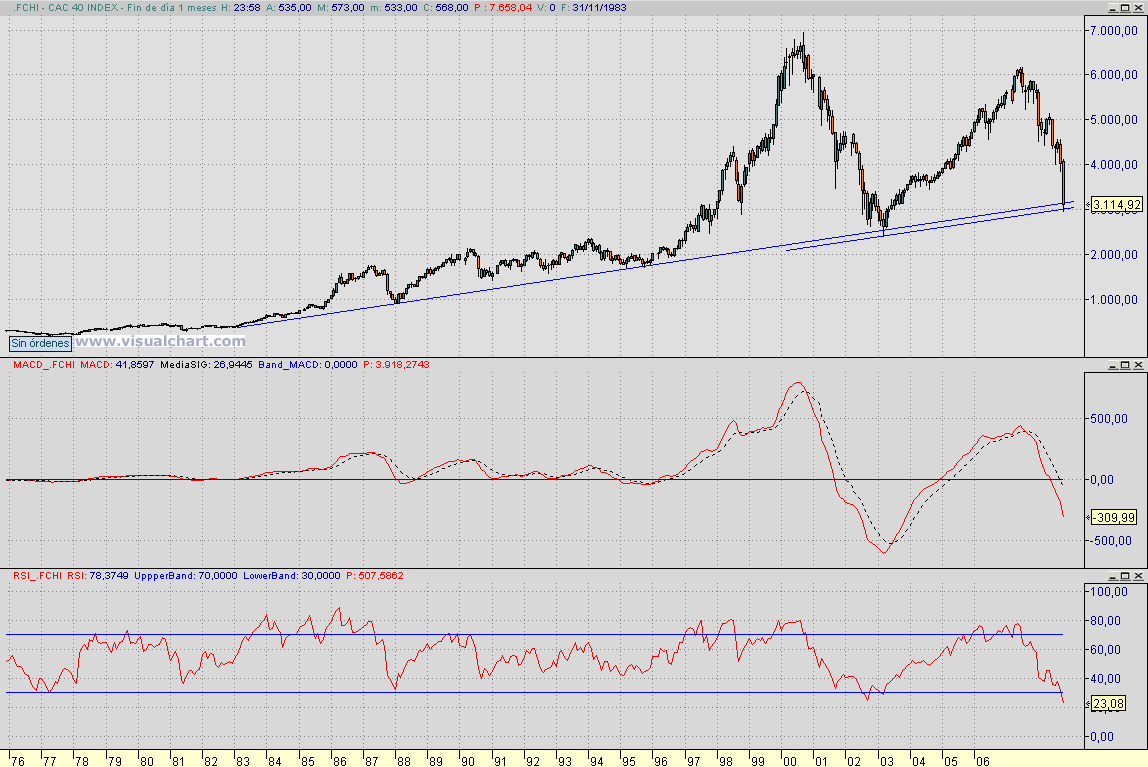 Y así podría seguir poniendo ejemplos. Como ves Vil, otra opción sin mirar la luna era recurrir al análisis técnico. Por poner un ejemplo muy ilustrativo, (es el único índice del que tengo datos del 29) tenemos el Dow apoyándose con una precisión milimétrica en el canal alcista iniciado tras el crash del 87. La duda es hasta donde durará el robote pero de toas formas me da que antes o después romperá el canal y como cumpla con el objetivo del canal pues nos vamos a 1400