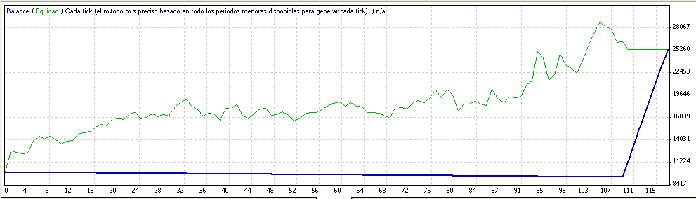 En su favor debo admitir que al principio hay unos $250 perdidos en operaciones que no tenían que haberse relizado, ya que puse muy pocas barras en el inicio, comparados con el periodo óptimo (400).