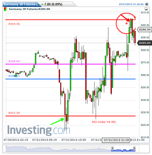 b) Long +1@ 8.373 en la barra que empieza en 15:45. Racional: Pese a no alcanzar Z2, por extensión de rango e interpretando la poderosa barra que forma El FDJI en esa misma barra, un martillo bastante claro en barra de 15' y un reversal más claro aún en barra de 5'. En el FDAX no está tan claro el reversal, pero se asume que el índice centroeuropeo seguirá "servilmente" a su homólogo yankee.