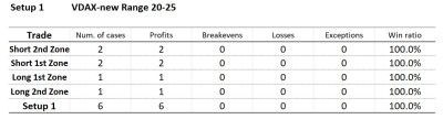 1) al igual que hacemos con el resto de estadísticas he analizado los datos por nivel de volatilidad, por lo que de los 100 días analizados, el 47 que aparece en la tabla nos indica que durante 47 días, el FDAX cotizó con valores de volatilidad comprendidos entre 20 y 25 del VDAX-new.