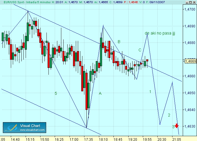 Las mismas ganas que tu, tengo yo de que baje desde aqui, pero cuando diseño una entrada y un posible recorrido trato de pensar también donde puede estar el error o el engaño en mi análisis, sobre todo si voy a medio plazo, porque la cosa es que en estos casos, de estar ganando lo que ya gano paso a la posibilidad de entrar en pérdidas, ya que el stop esta por encima de la entrada y no con break even, al menos en la entrada mas favorable. En intradiario no, pero en medio plazo es la manera salvo que te des cuenta de la equivocación o del giro antes de que lleguen a tu posición. Por esto estudio, que hará el precio si mi sitio era un sitio pero no "el sitio", donde esta el error antes de ver que era un error. Te pido que mires este posible recuento, no por más cabezoneria se va a ir donde queremos, yo creo que estamos bien colocados pero si no es así cual fué el fallo? Donde está la posibilidad remota pero posibilidad al fin y al cabo que despues de hecha se verá muy clara pero ahora no? Porque dicen que elliot se ve a toro pasado?? Porque hay que estudiar todas las posibilidades y podría ser que esa onda 1 tan pequeña comparada con la 3, no sea la UNO si no la 1 de la UNO. Puesto que elliott no es mi fuerte necesito vuestra opinión, existe esa posibilidad o no existe? Porque si existe, la 3 puede parar aqui, en 1,4940 o en donde le dé la gana no??