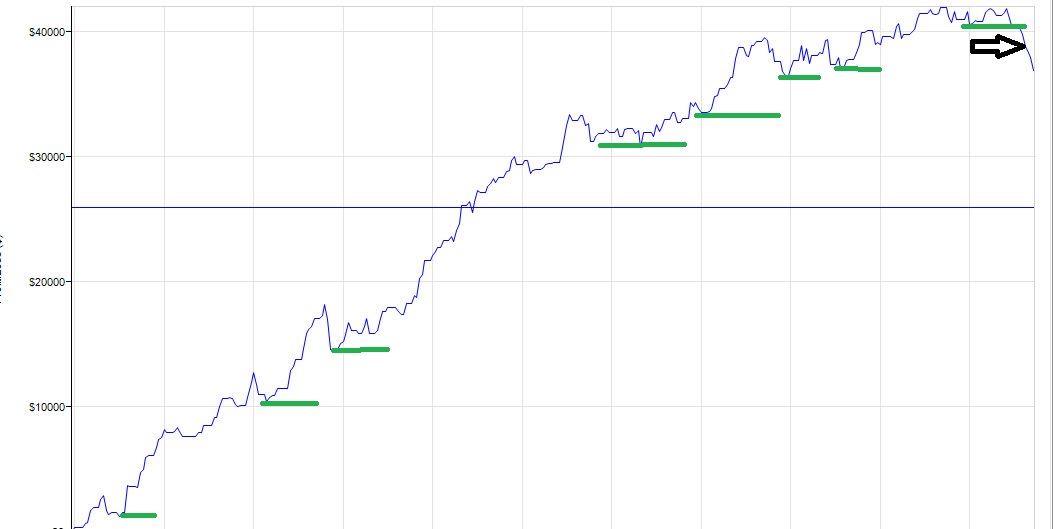Como norma, pivoteo la gráfica de beneficio, dicho de otra manera... minimos crecientes siempre, en el momento que rompo el minimo creciente anterior, sé que algo está pasando y que le afecta y afectará al sistema en el futuro, y aunque hagamos un backtest 50 años, el cual te de un porcentaje de DD asumible, no tiene que ver nada con la operativa real.