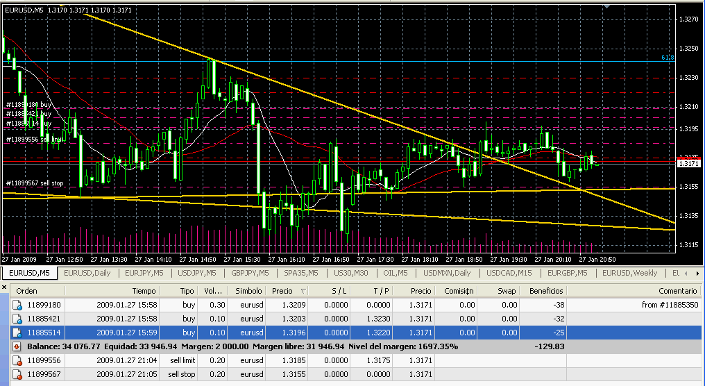 Joer que si valen, no lo sabes tu bien, y si el metatrader tuviese las órdenes de Oanda que se activan al llegar a un punto y luego abren posición en el retroceso, eso sería la leche. Podrías dejar una estrategia preparada para un día entero a base de limitadas, sin programar.Ciclo escribió:Me he quedado de una manera muy similar. Lo de usar una Sell limit lo tengo que estudiar. Por lo que veo es un arma mas, ¡Y yo que pensaba que ese tipo de órdenes no servian para nada!